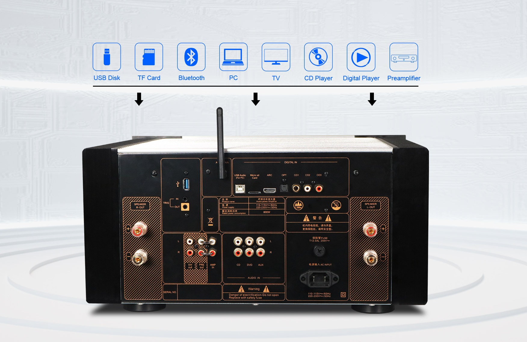 The AD-99D also features a SW-OUT subwoofer output for 2.1-channel immersive bass, and a separate preamp/power amp design (removing the back-panel U-shaped connector converts it to a pure power amp) for personalized setups. It supports USB/TF lossless playback (WAV, FLAC) and high-quality Bluetooth, balancing audiophile demands with everyday convenience.