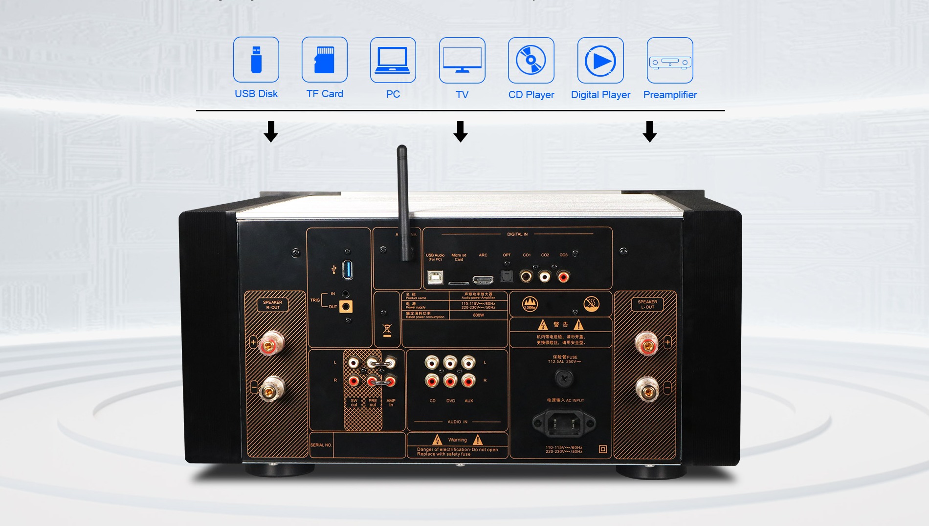 p design (removing the back-panel U-shaped connector converts it to a pure power amp) for personalized setups. It supports USB/TF lossless playback (WAV, FLAC) and high-quality wireless, balancing audiophile demands with everyday convenience.