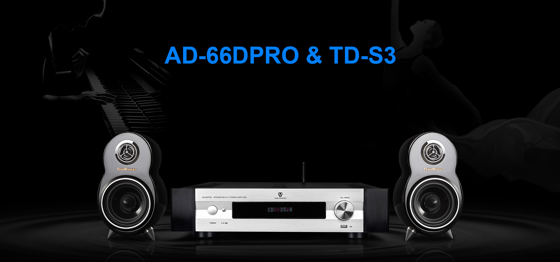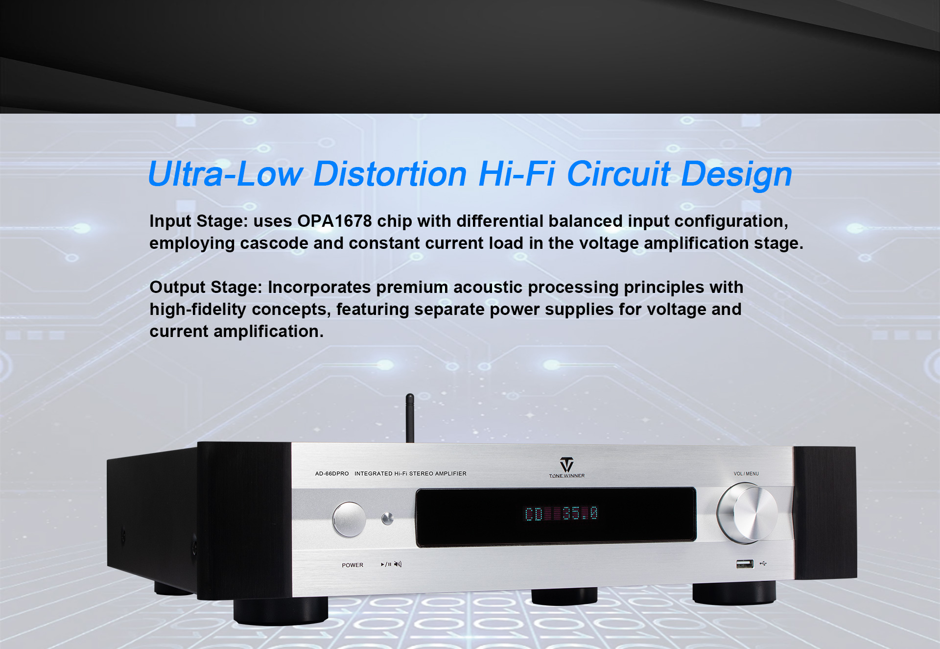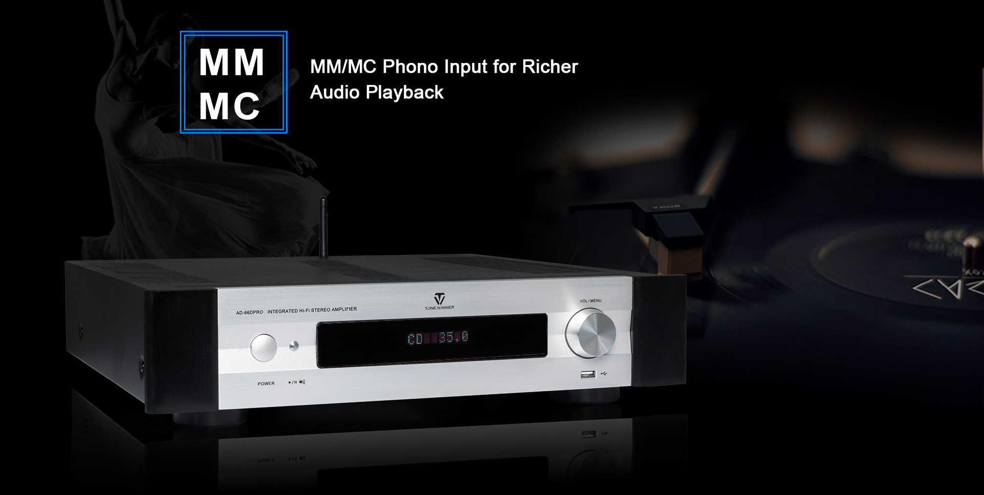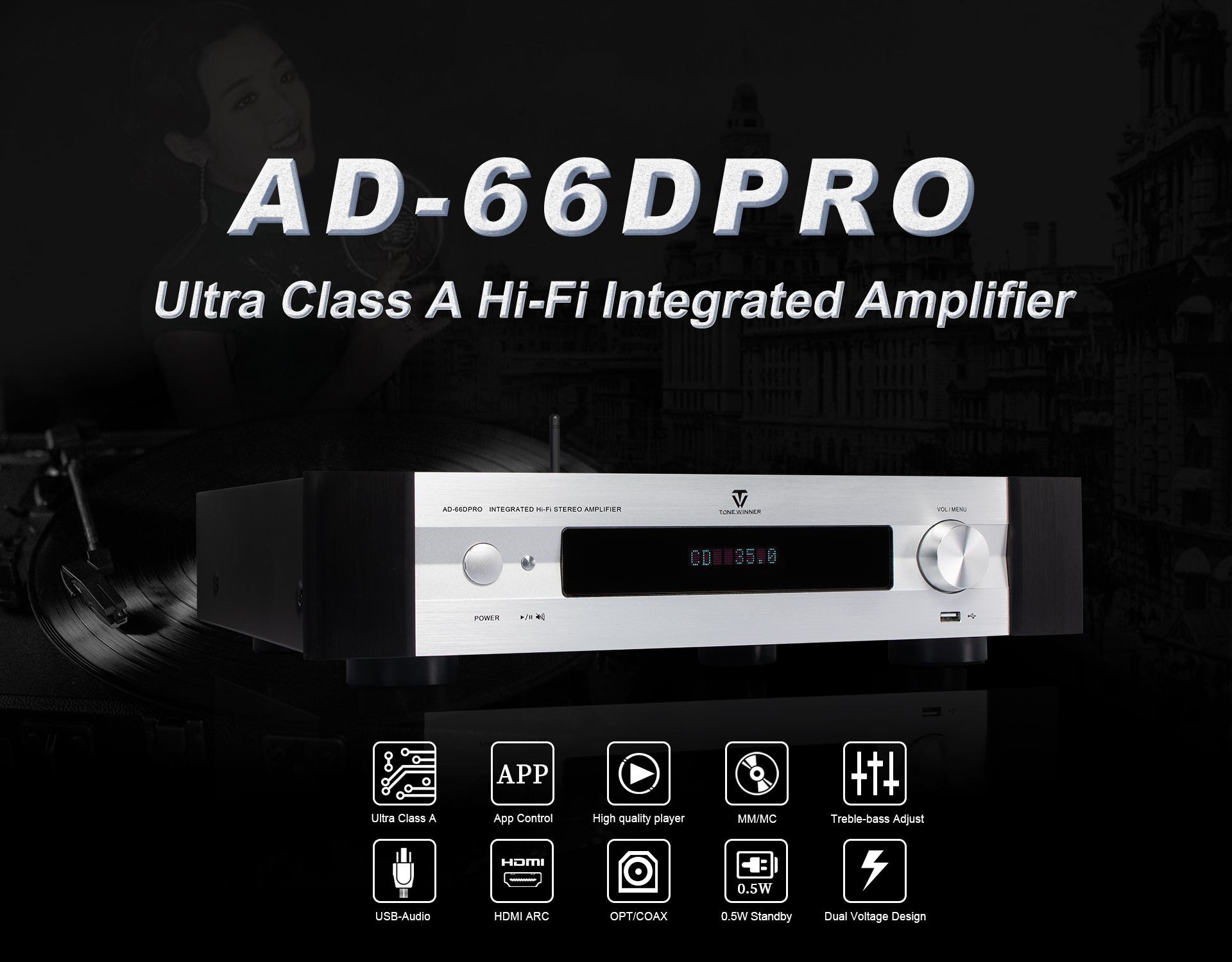 AD-66DPRO is an upgraded version of AD-66D. It has a new MM/MC phono interface, and is equipped with a new mobile APP. The AD-66DPRO keeps the most favor advantages and improve with the new features, it is a high recommend entrance level Hi-Fi amplifier.