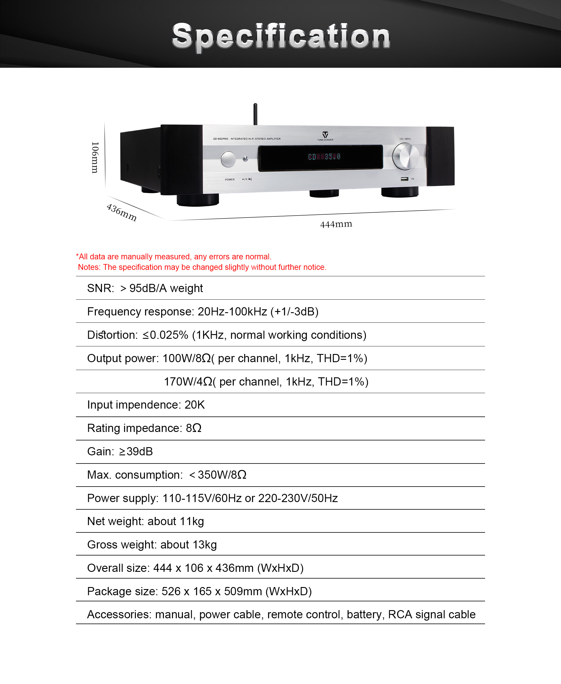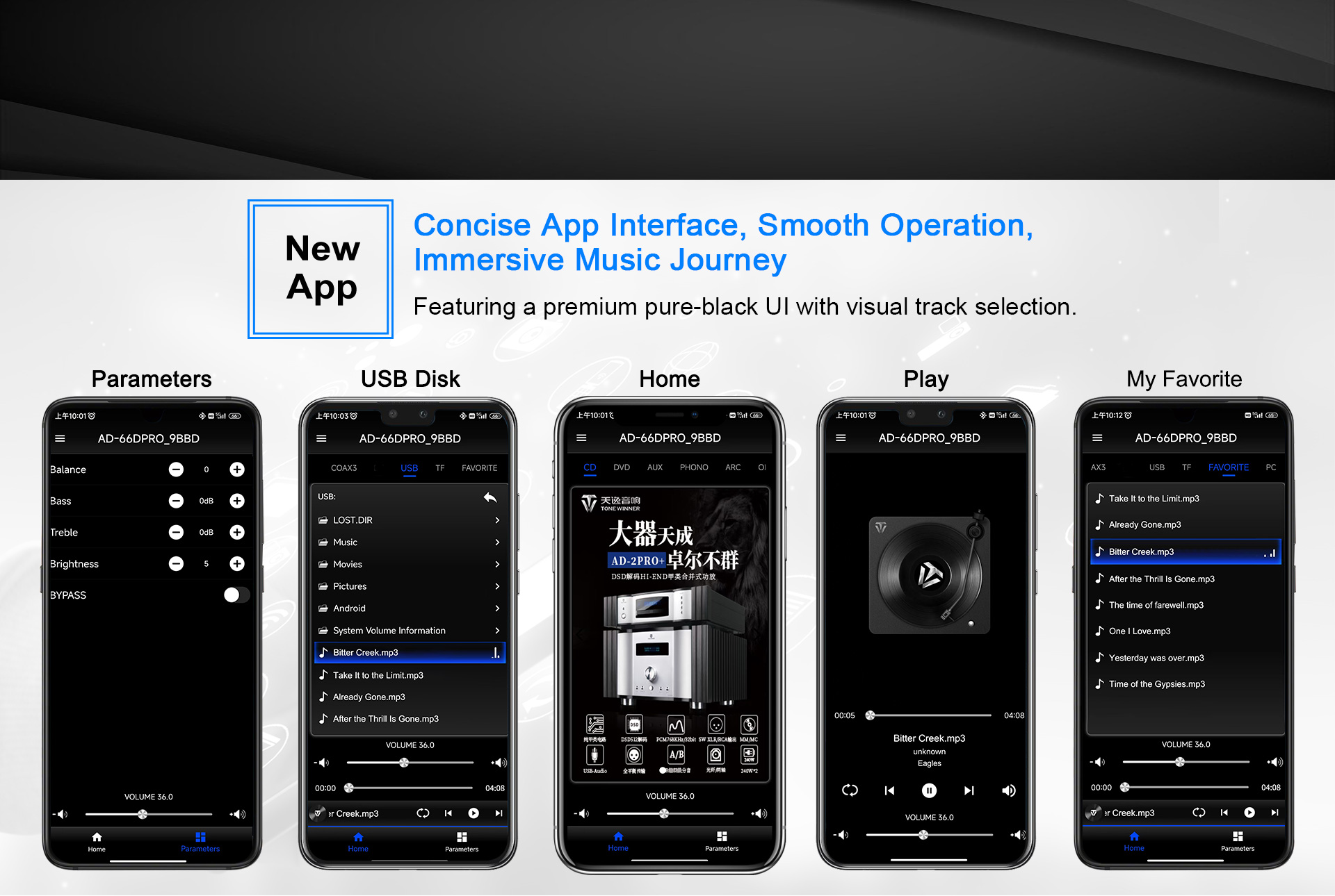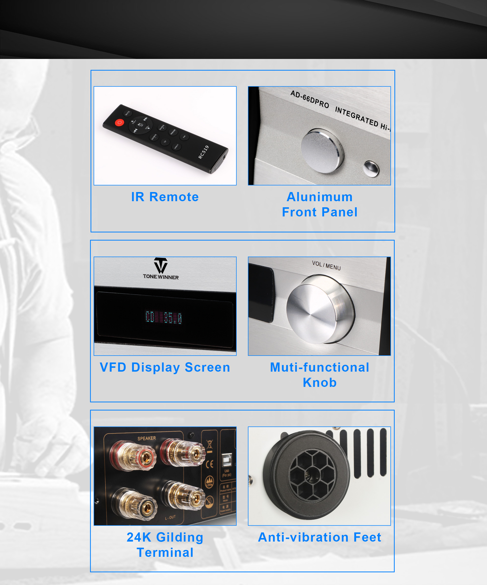 AD-66DPRO is an upgraded version of AD-66D. It has a new MM/MC phono interface, and is equipped with a new mobile APP. The AD-66DPRO keeps the most favor advantages and improve with the new features, it is a high recommend entrance level Hi-Fi amplifier.