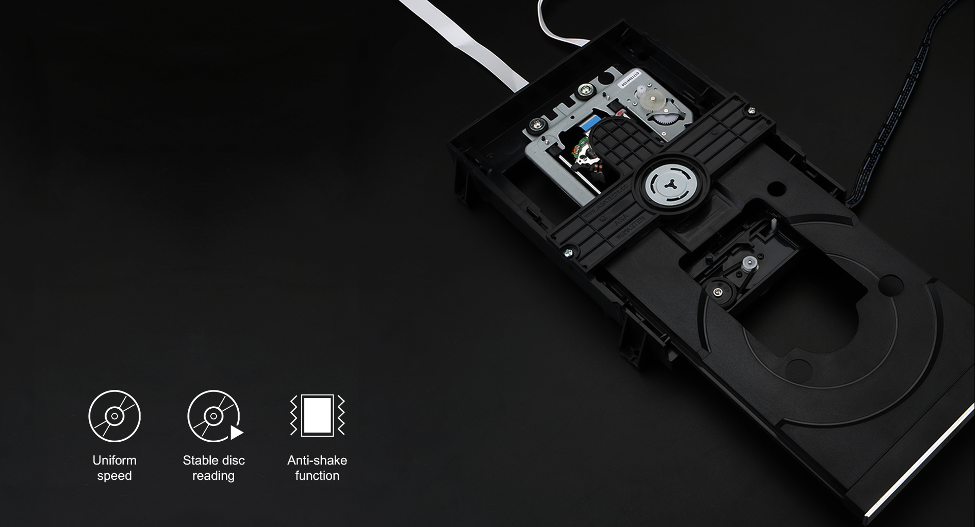 The carefully selected high-quality custom movement has a uniform rotation speed and strong disc reading ability. A thick metal shockproof base is added to the bottom of the chassis to enhance the shock-absorbing effect, making the optical head disc reading system stable and uniform, with a strong sense of balance.