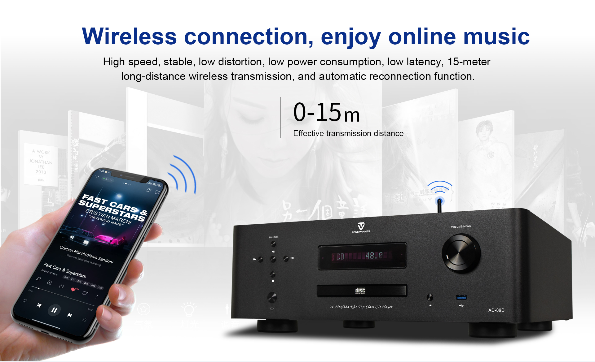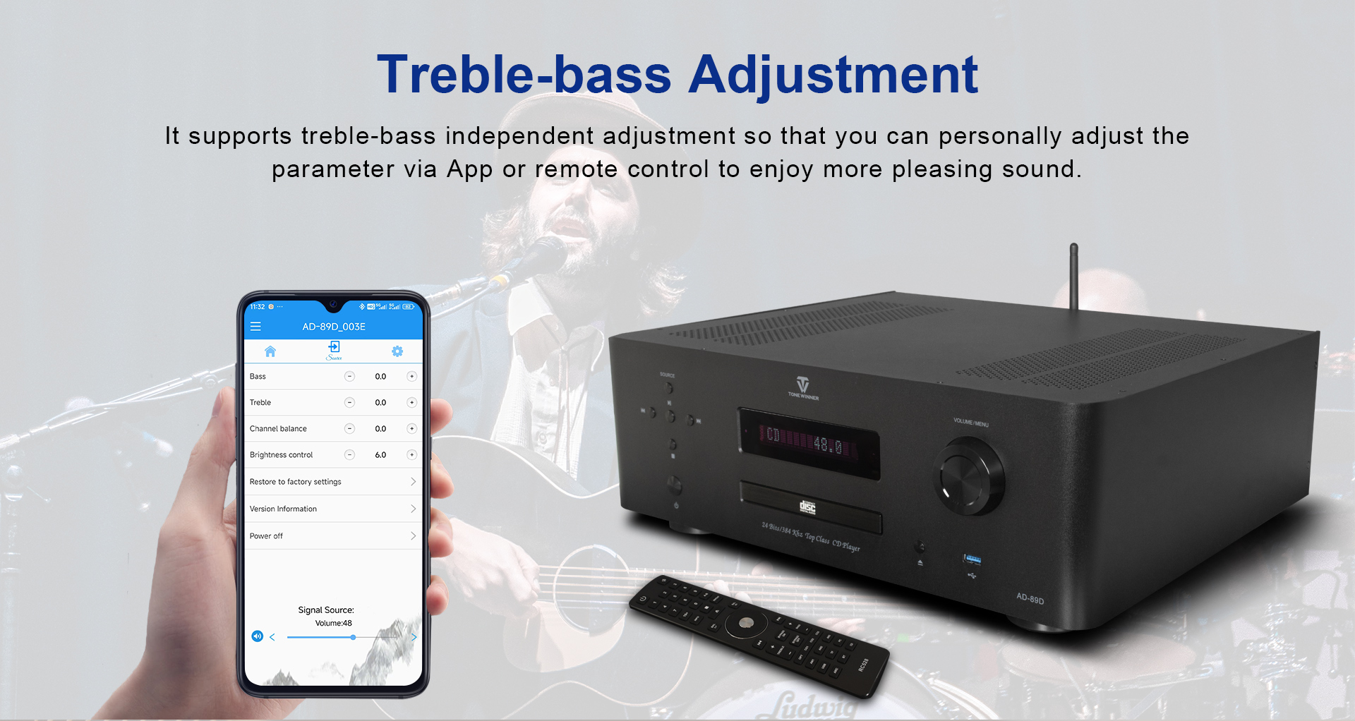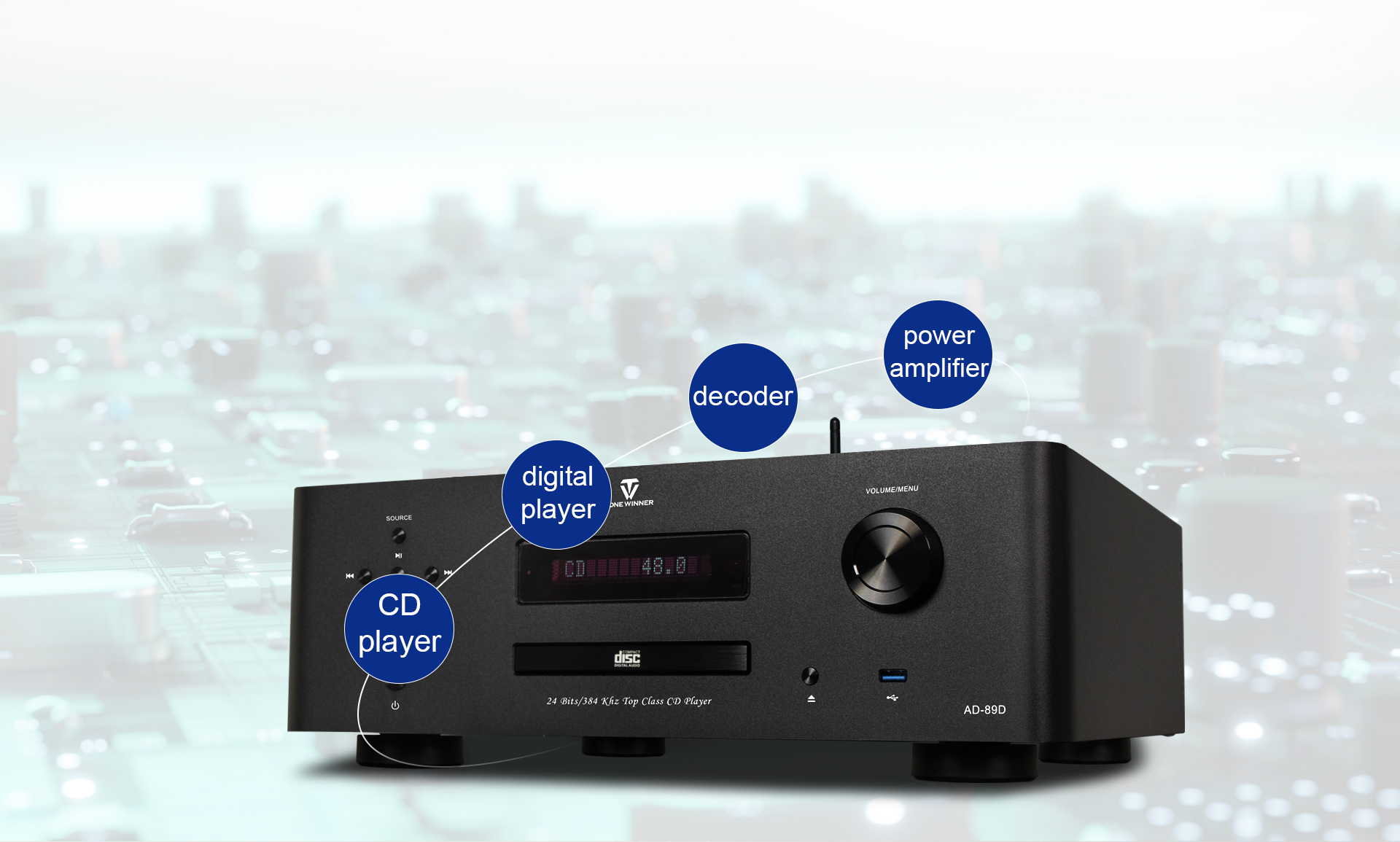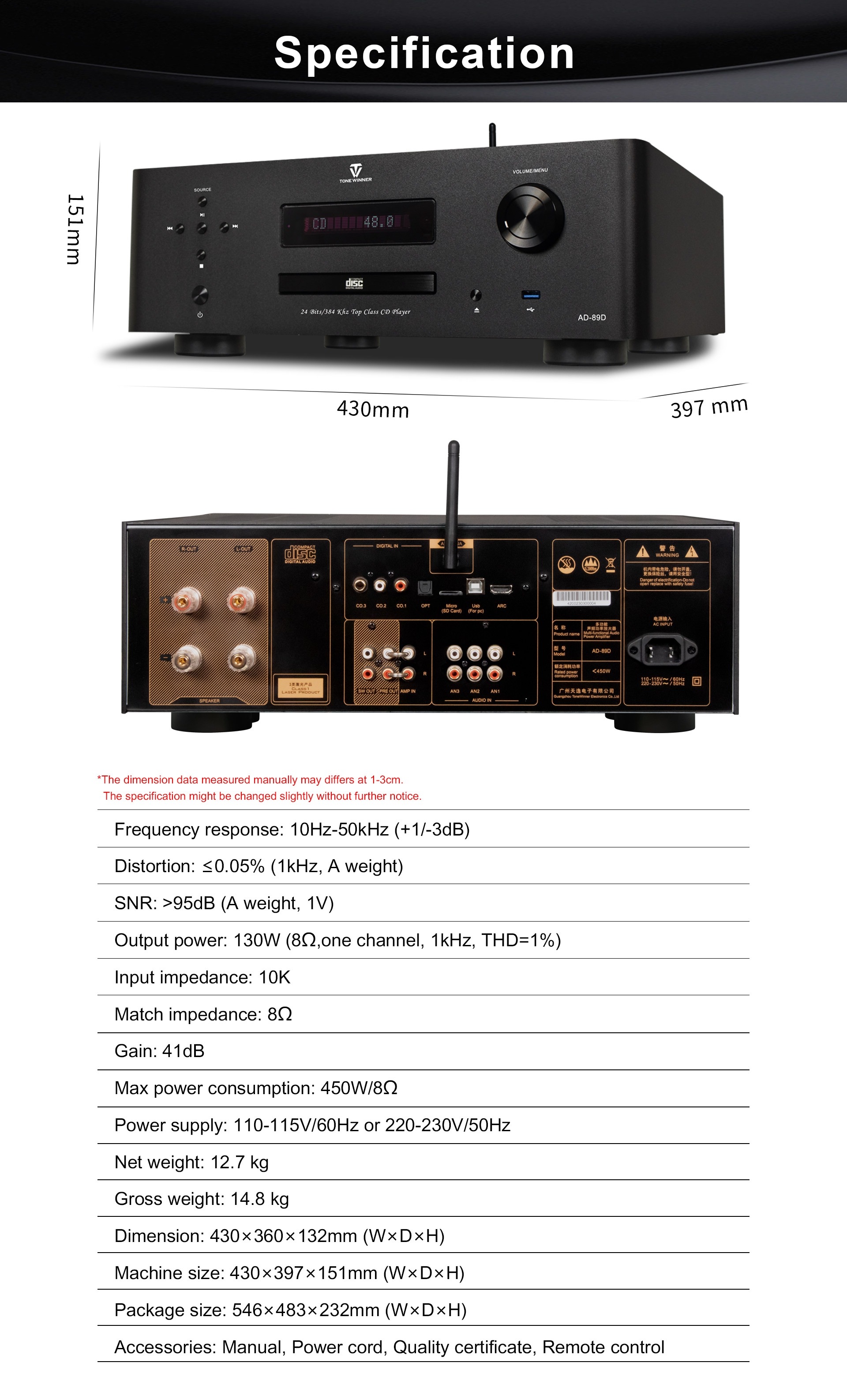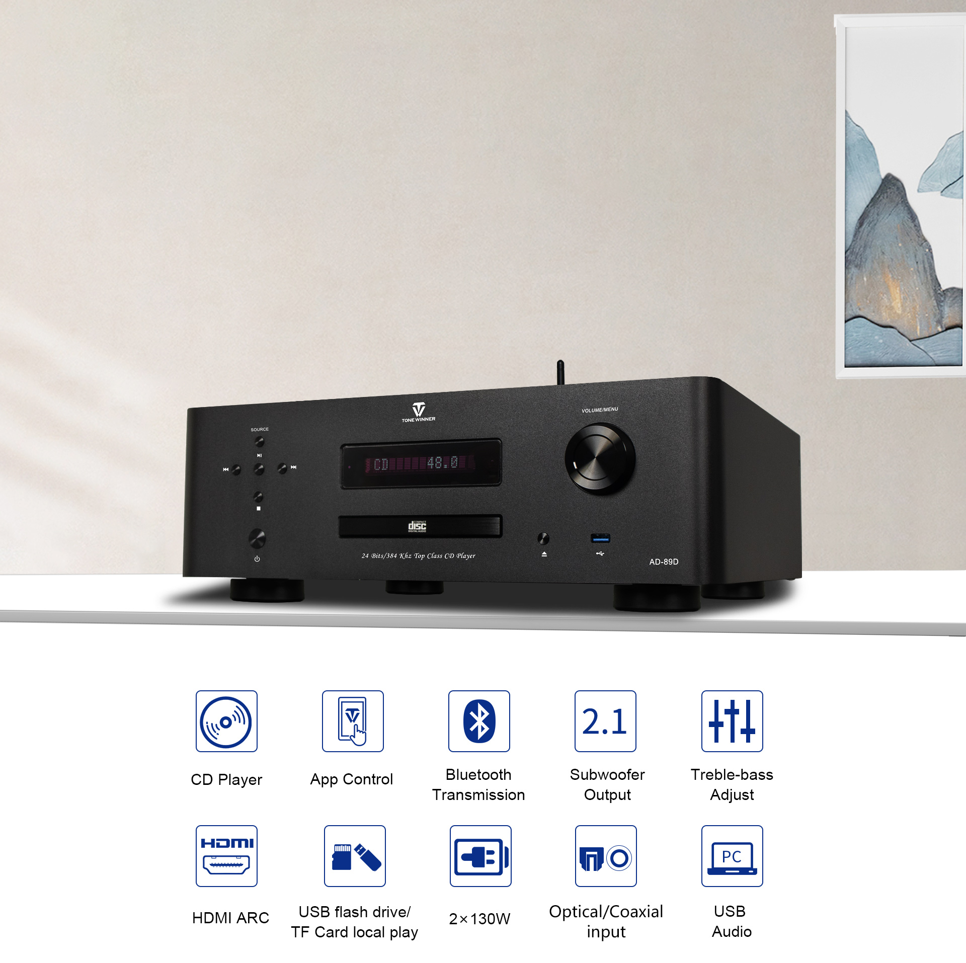 AD-89D is an Hi-Fi integrated amplifier, which designed with Tonewinner's 30 years technical experience,and to meet the market desire of multi-functions.This product combined with multi-functions such as CD player, streaming media player, preamp decoder and amplifier. The circuit is mature and stable, the materials are solid and high quality, making the product reliable and durable.The sound is round and delicate, the cost performance is extremely high, it is the representative masterpieces of the new generation of digital Hi-Fi amplifier.