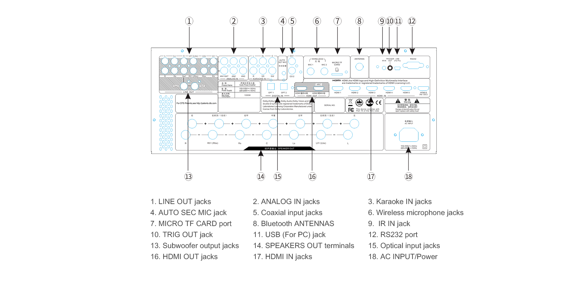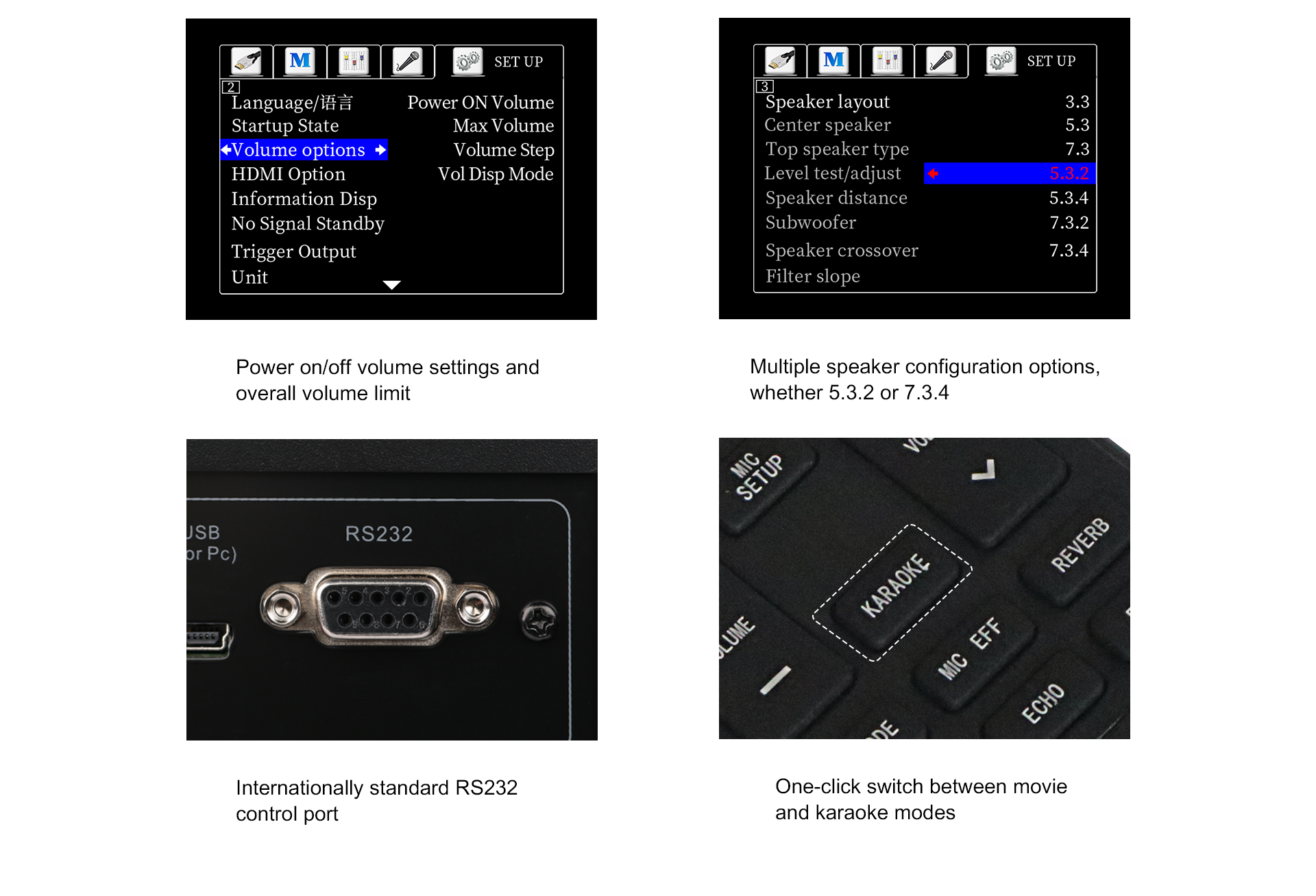AT-2300PRO is a Dolby Atmos theater & Karaoke integrated amplifier. It's a all in one machine which combines home theater system, personal music center and professional Karaoke system. AT-2300PRO's professional 5.1.2 channel immersion karaoke system is pioneering in audio industry. Support audio return channel (ARC), which can make smart TV turn into song-order machine.