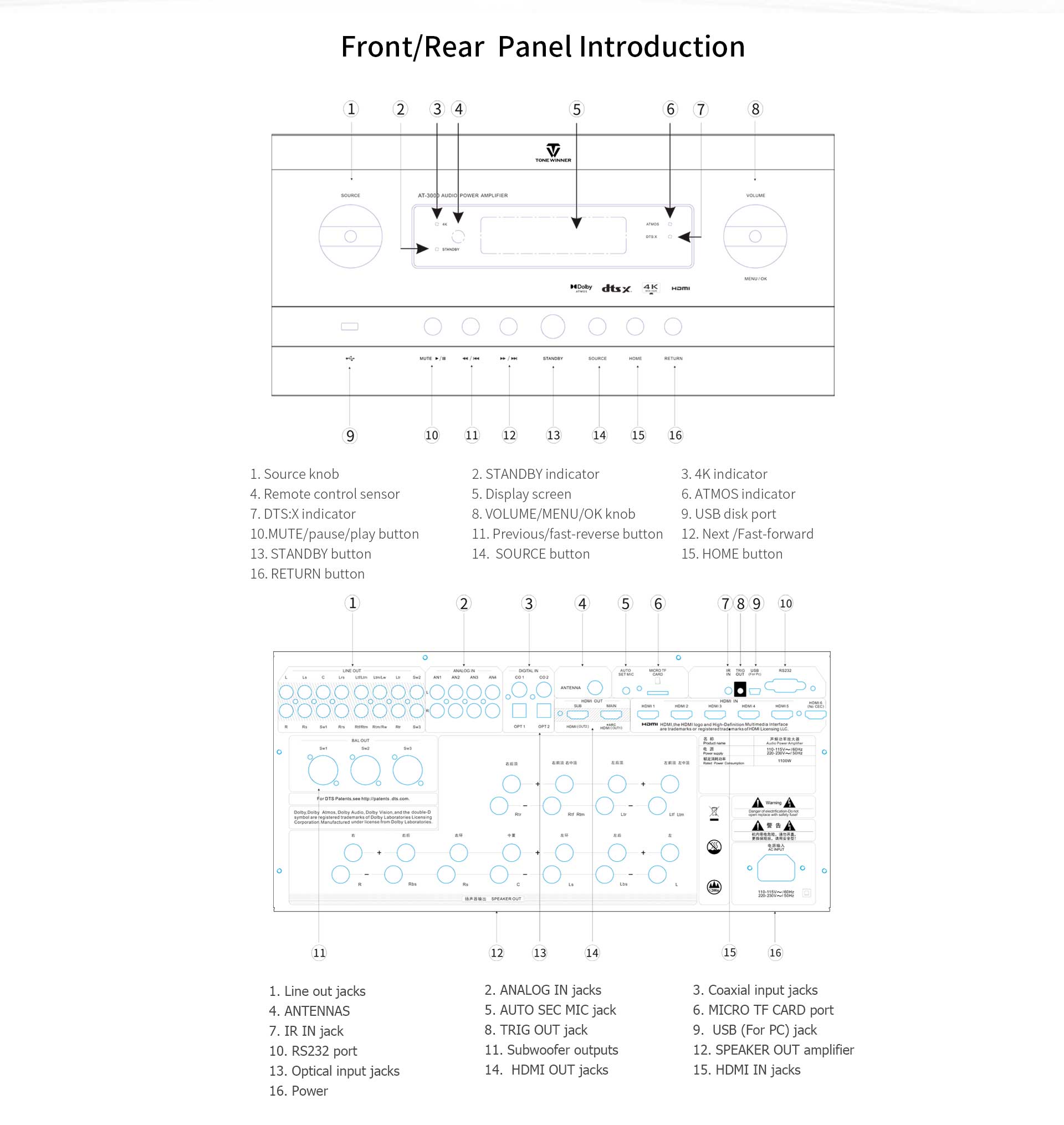 AT-3000 is an AV receiver integrated audio power amplifier which supports Dolby Atmos, Dolby TrueHD, DTS:X and their downward iterations. It also supports HDR and 4K. It also supports HDMI 6 in 2 out, eARC, TF card, USB disk, OSD menu, RS232, App control, auto acoustic test room calibration, etc. It supports 240W/8Ω for L/R/C channels and 120W/8Ω for other eight channels. It’s a multi-functional integrated amplifier AVR for high-end home entertainment.