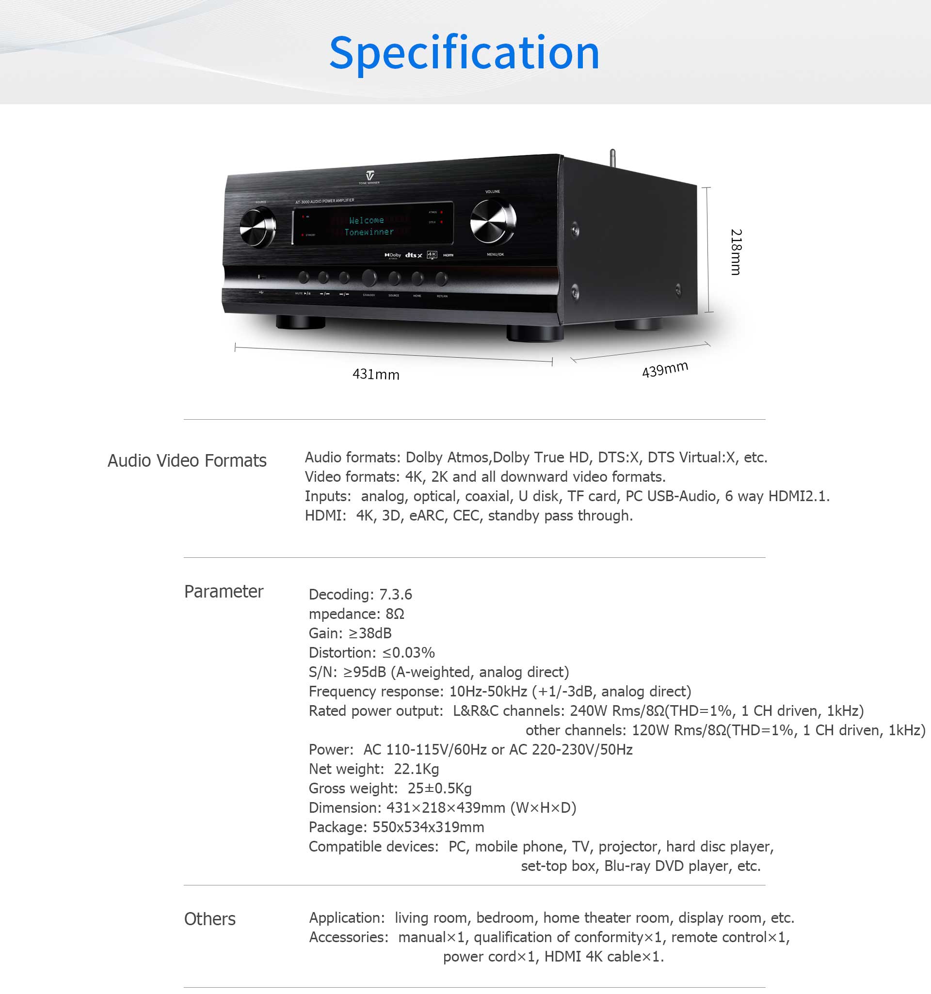 The firmware and software are designed and edited by Tonewinner’s own designers with original source code and patents, and all products are produced by one standard in strict management. Handling AC 110V to 230V power supply voltage, AT-3000 AV receiver offers pleasing audio video entertainment to the world.