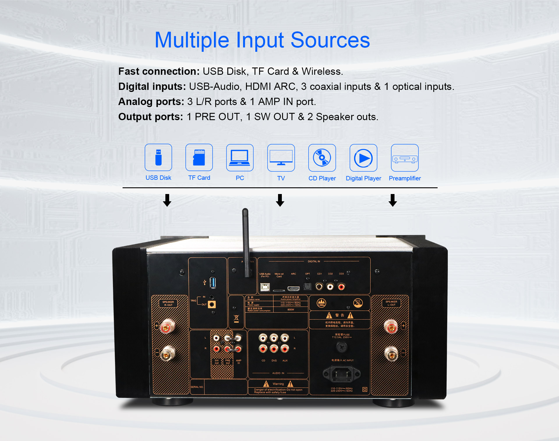 1. Support PC USB-Audio, HDMI ARC, 3 way coaxial inputs, 1 way optical input, 3 way analog inputs and 1 way subwoofer output.