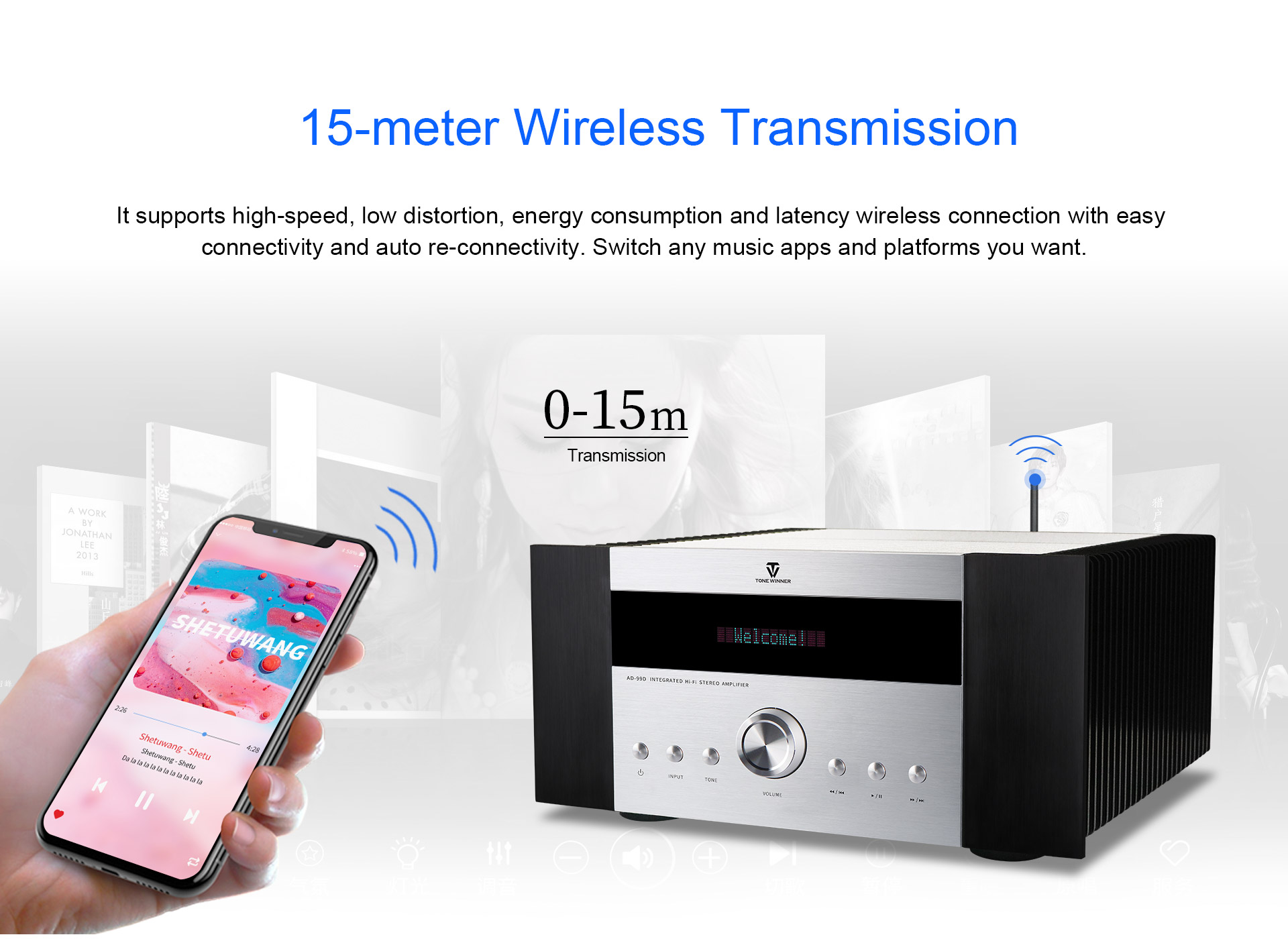 AD-99D is a special Class A Hi-Fi integrated amplifier which supports 128G USB disk, TF card and lossless audio formats including WAV, FLAC, APE, etc. It also supports treble-bass independent adjustment, subwoofer output and original App control. As an original supplier, Tonewinner always warmly welcomes distributors, partners and customers around the world.
